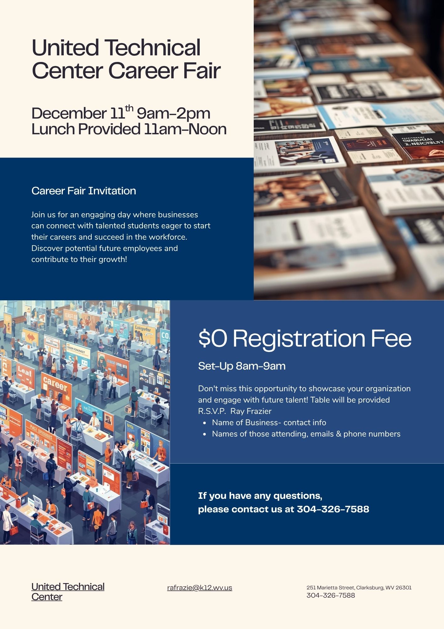 ----------------------------------------United Technical Center will be having our annual Career Fair on Thursday, December 11, 2025, from 9:00a.m. until 2:00p.m. We would like to invite your business/organization to this event. A table ...read more